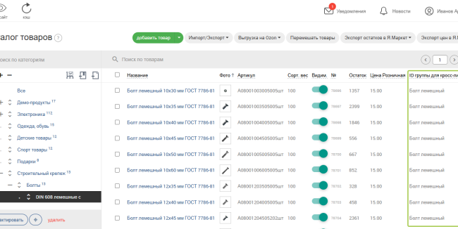 Далее, нужно подсказать системе, какие товары входят в одну группу, путем указания общего "ID группы для кросс-линковки". Это можно сделать либо у каждого товара по отдельности, либо массово выбрав много товаров и установив им одно и то же значение ID группы для кросс-линковки.