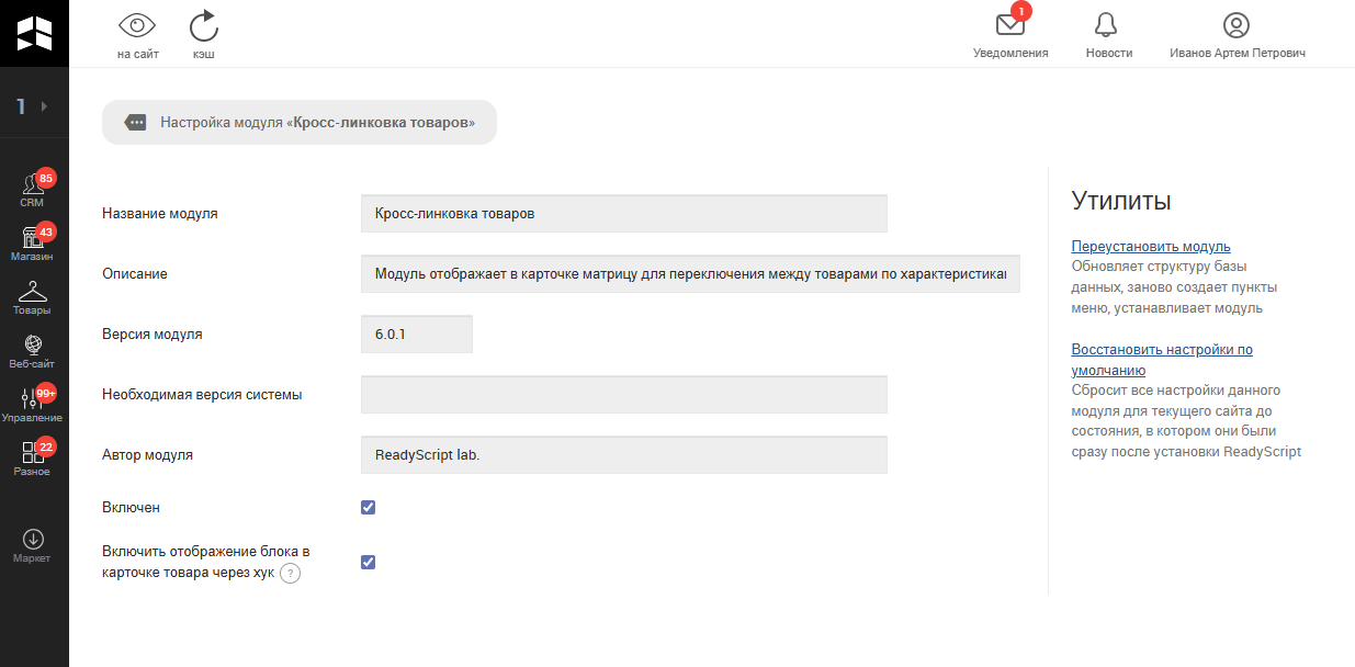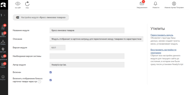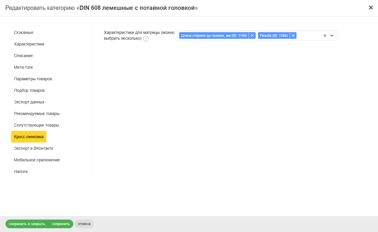 Сразу после установки модуля в настройках категорий товаров появится вкладка "Кросс-линковка", на которой будет располагаться поле "Характеристики для матрицы". Здесь нужно выбрать характеристики, которые и станут параметрами будущей матрицы у товаров. Это нужно настроить в каждой категории, где вы желаете, чтобы появилась кросс-линковка товаров.
