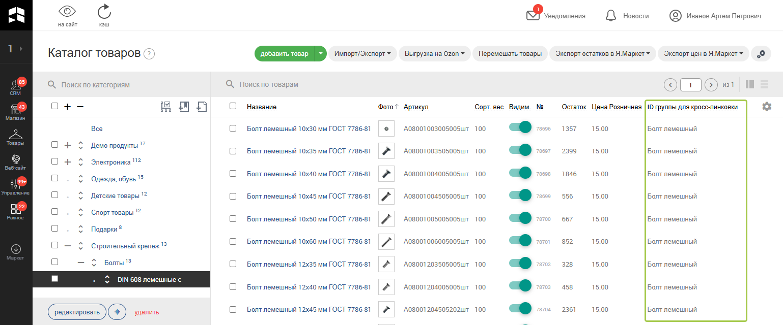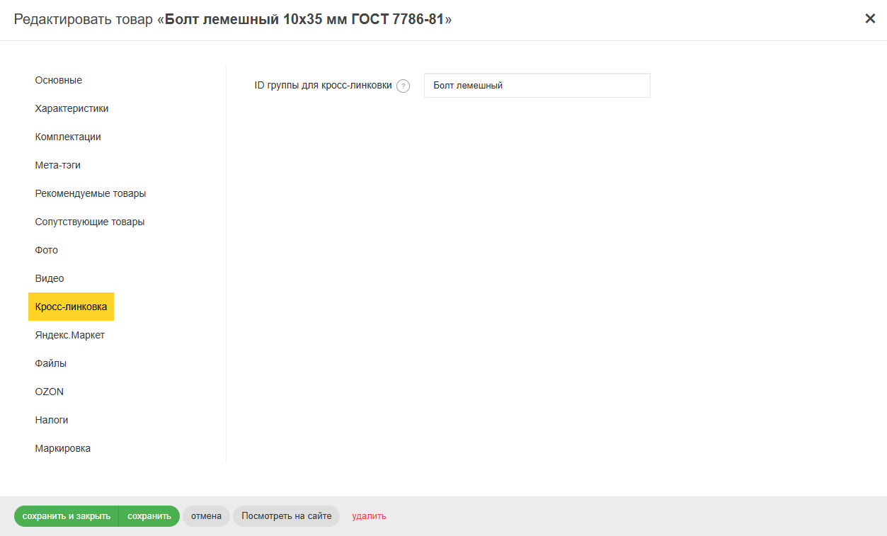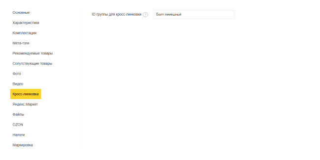 Список товаров, участвующих в одной группе формируется на основе значения поля товара "ID группы для кросс-линковки".
